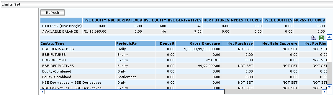 Limits Set keeps a track and displays the limits specified by the broker to individual users. The broker sets the limits for all the users and securities on daily and settlement basis for all the market segments.